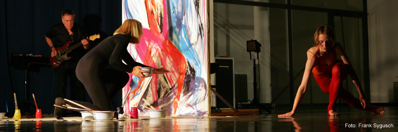 The Painting as an Event of Barbara Heinisch is a transdisciplinary Process Painting (in the studio and in public), wherein the figurative elements of expressionism connect with the movement tracks of informel.